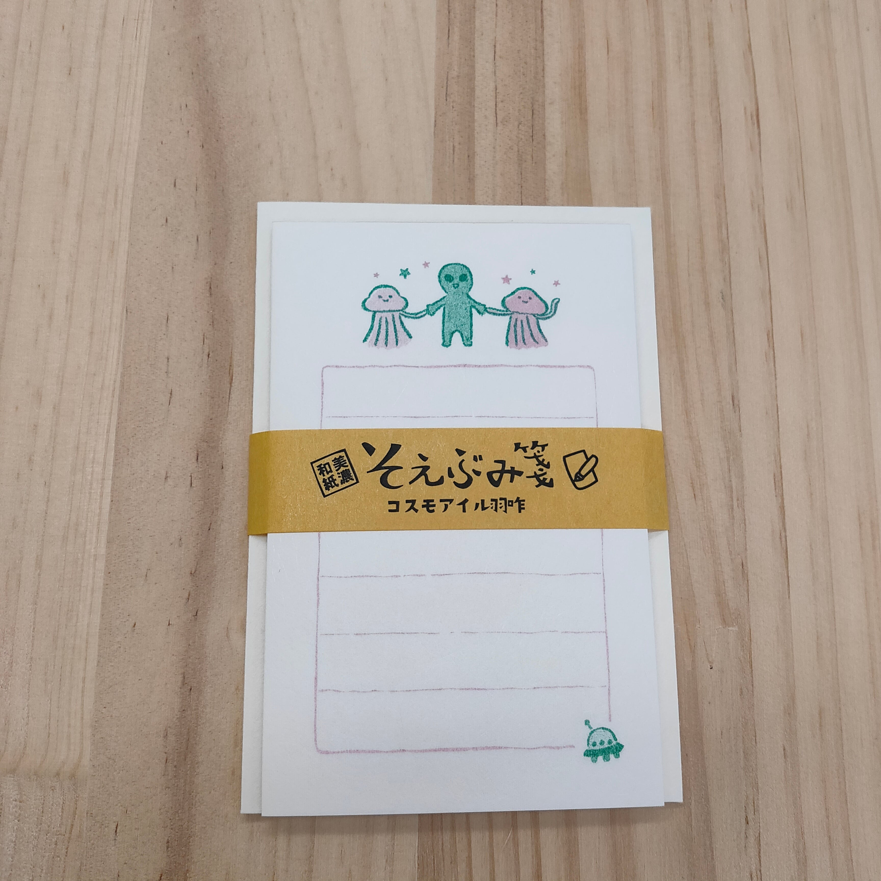 コスモアイル羽咋が贈るオリジナルデザイン、コスモアイルオリジナル便箋です。小さなミニ便箋とミニ封筒をセットにし、どこでも手軽に使えるサイズ感が魅力です。エイリアンのキャラクターがデザインされており、普段のメッセージをかわいく彩ります。