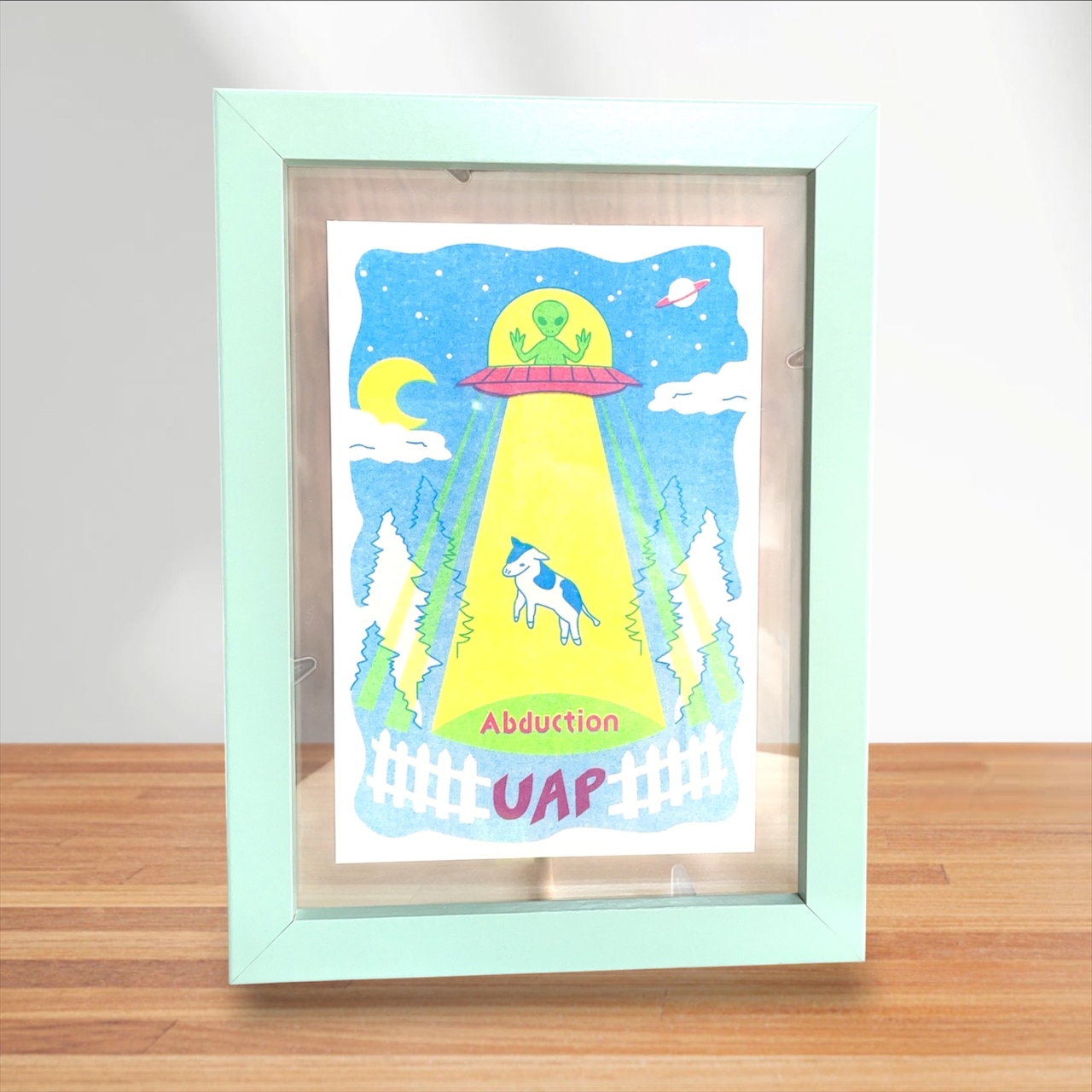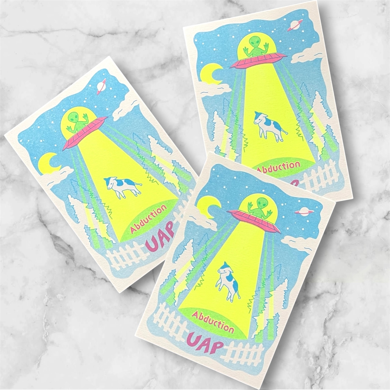 UFOに乗った宇宙人が、牛をアブダクションしている様子を描いたデザインです。