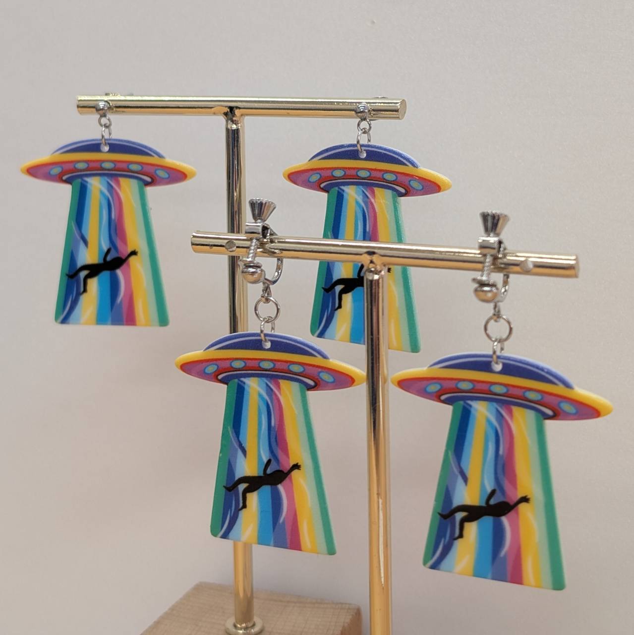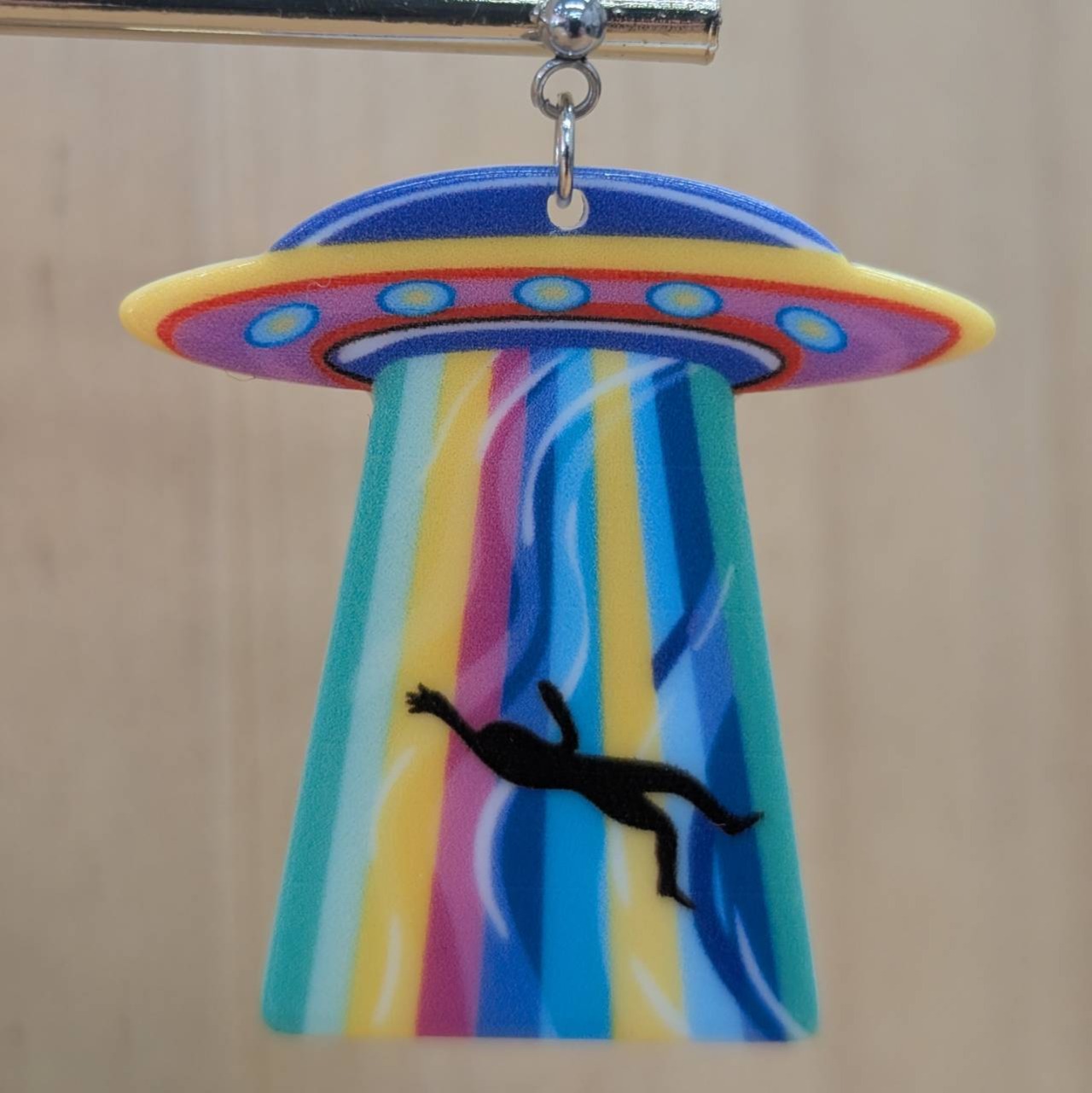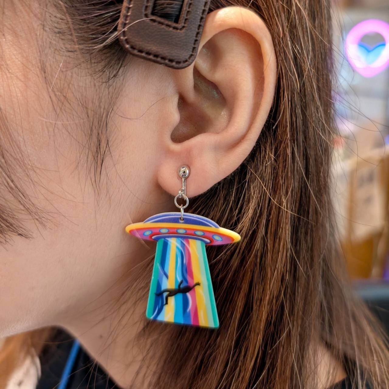 鮮やかな色合いとUFOに連れ去られているユニークなデザインがインパクト大!