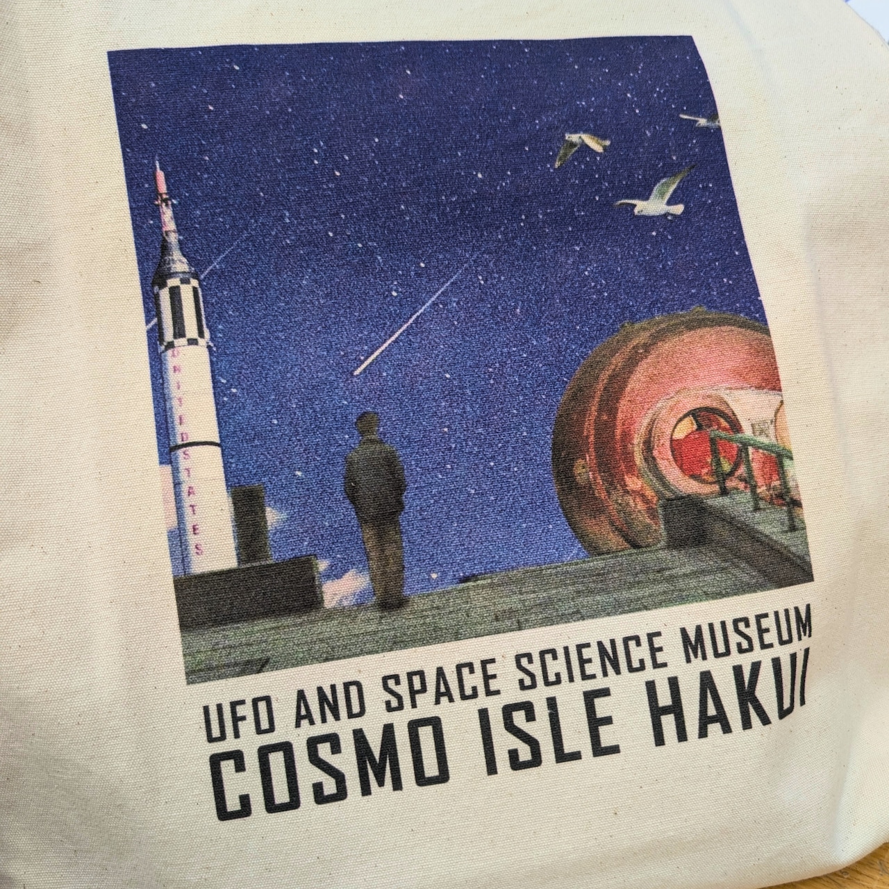 コスモアイル羽咋に展示されている「レッドストーンロケット」と「ボストーク宇宙船」をモチーフにした、レトロな雰囲気のエコバッグです。