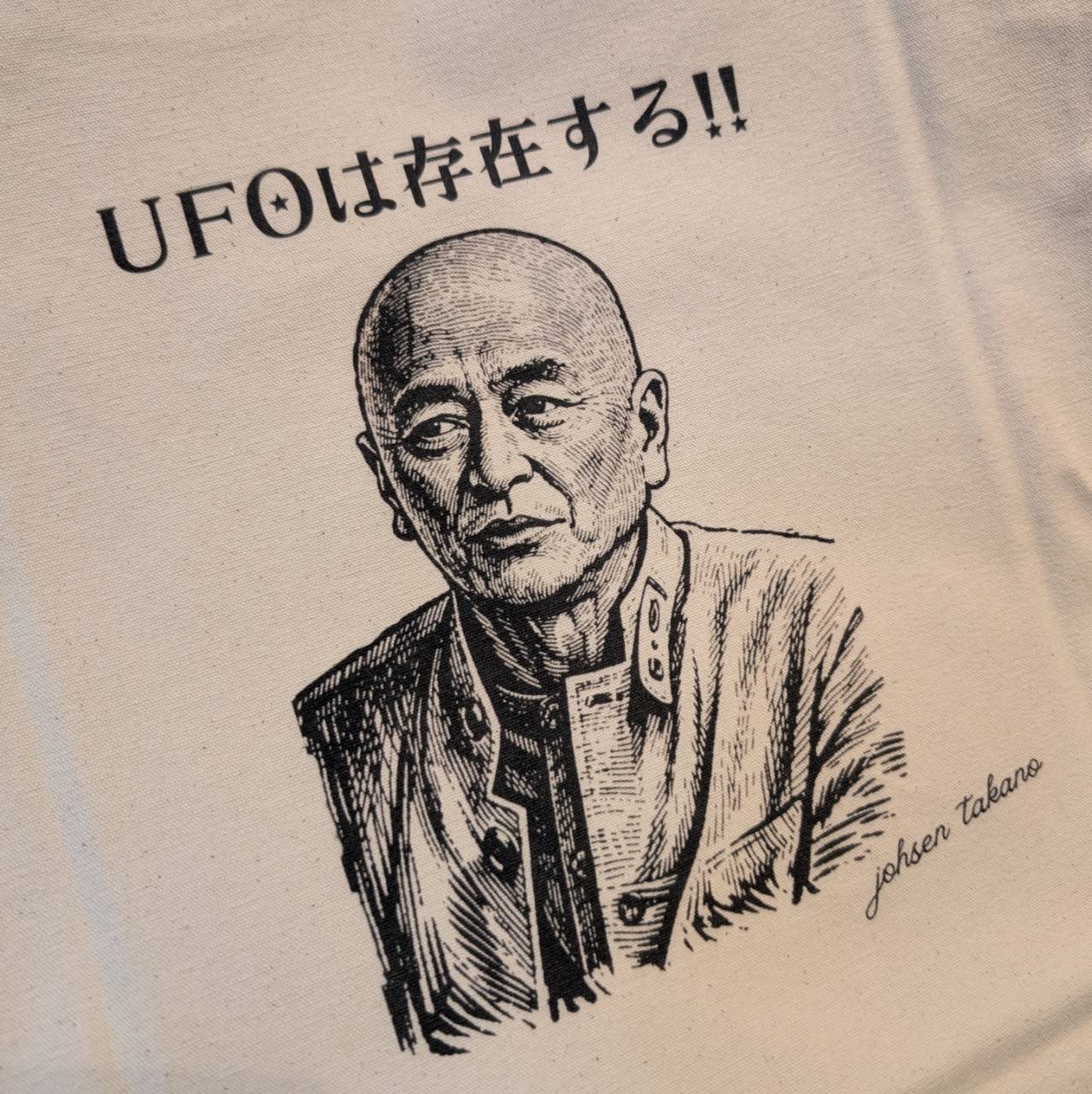 高野誠鮮さんのイラストと、力強いメッセージ 「UFOは存在する!!」 をデザインしたエコバッグです。