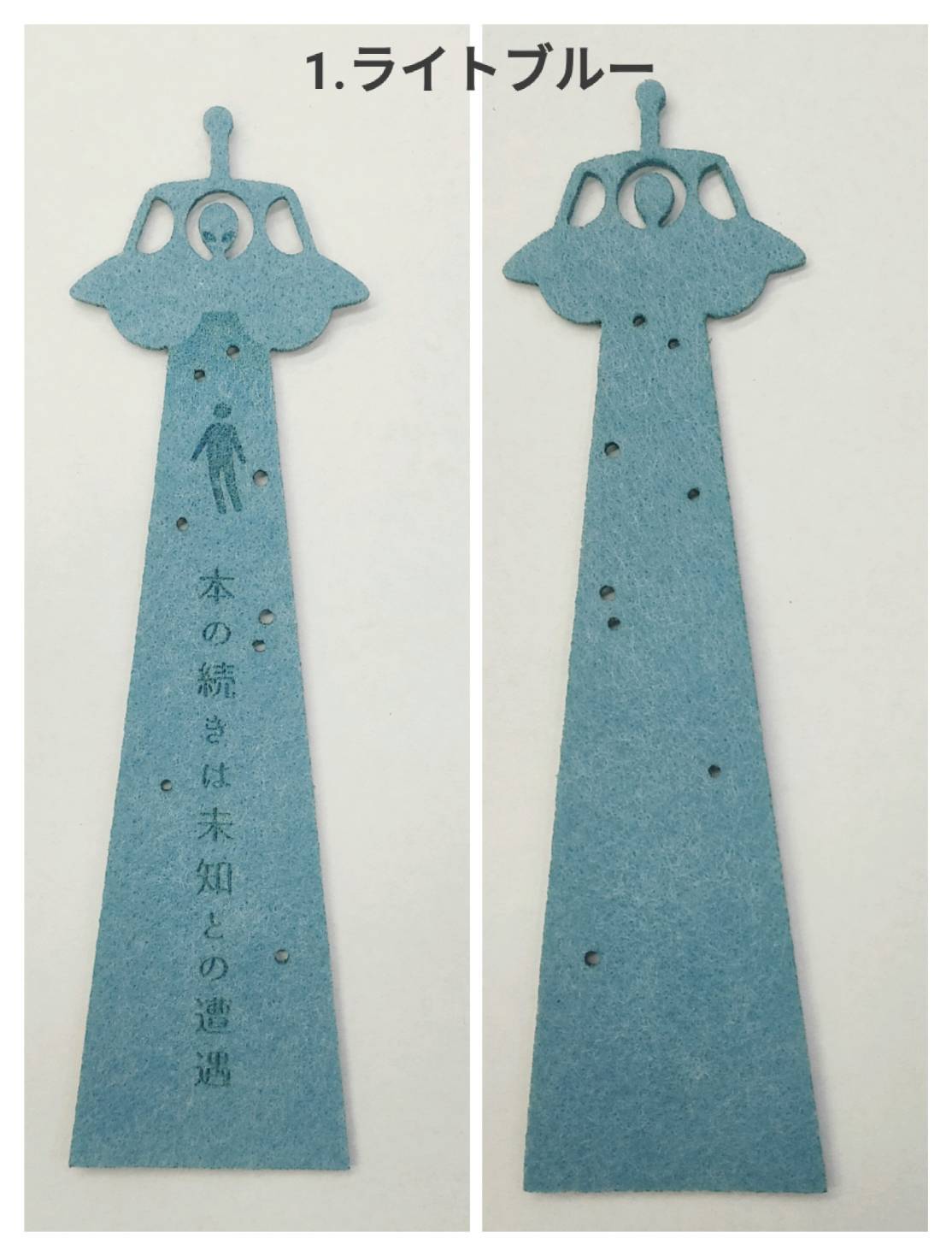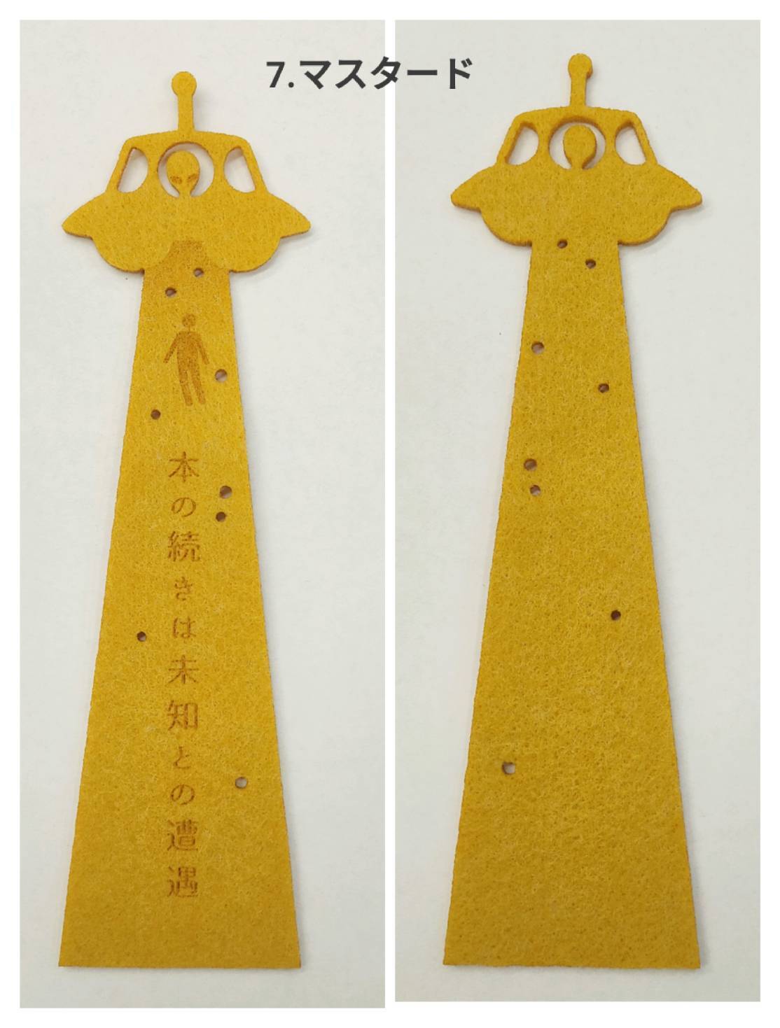 可愛らしいUFOの形が目を引くブックマークは、フェルト素材で優しく本のページを挟んでくれます。