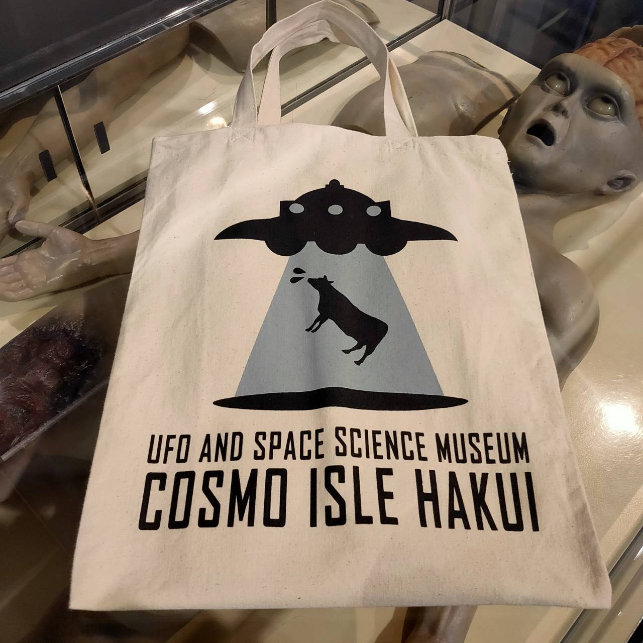 UFOに牛が連れ去られるイラストがとっても人気があります♪コスモアイル羽咋限定デザインです。A4サイズが収納できるエコバッグです。